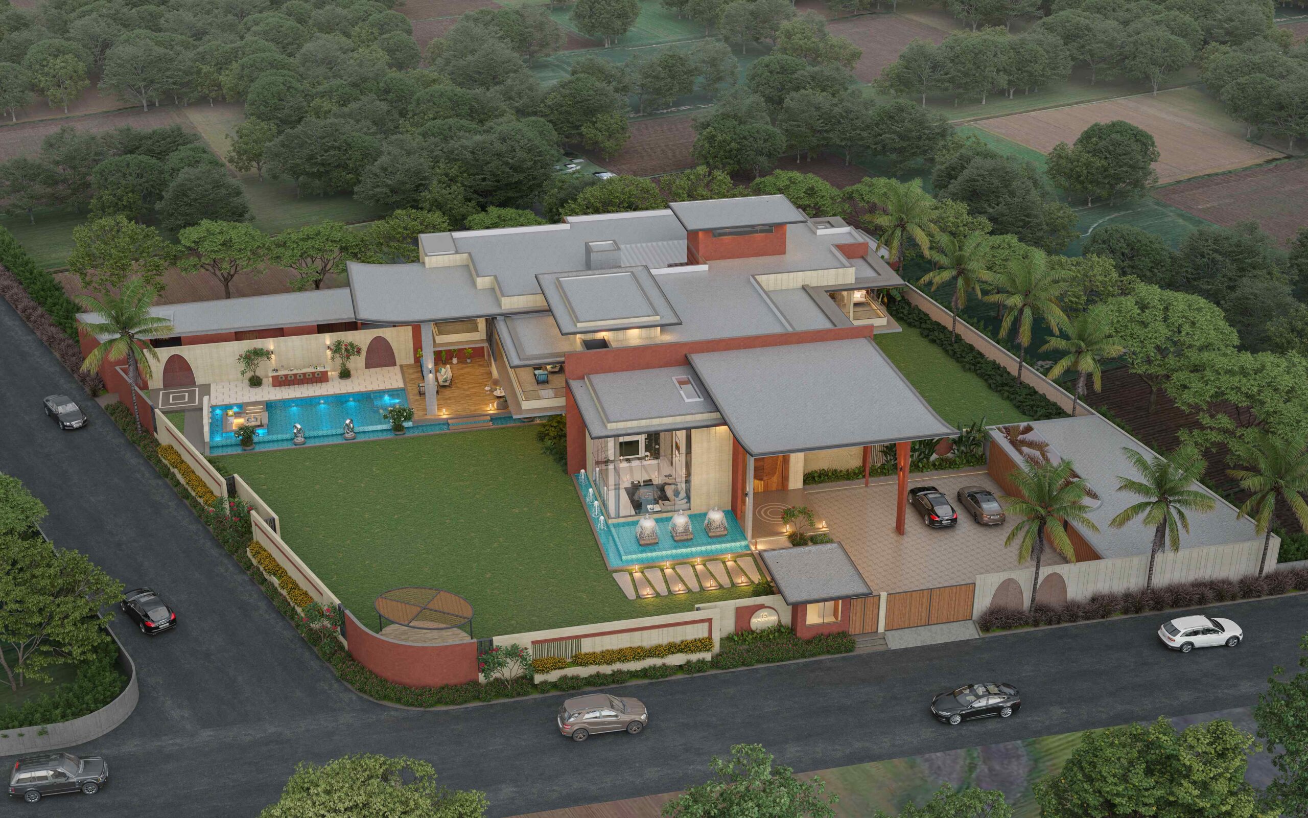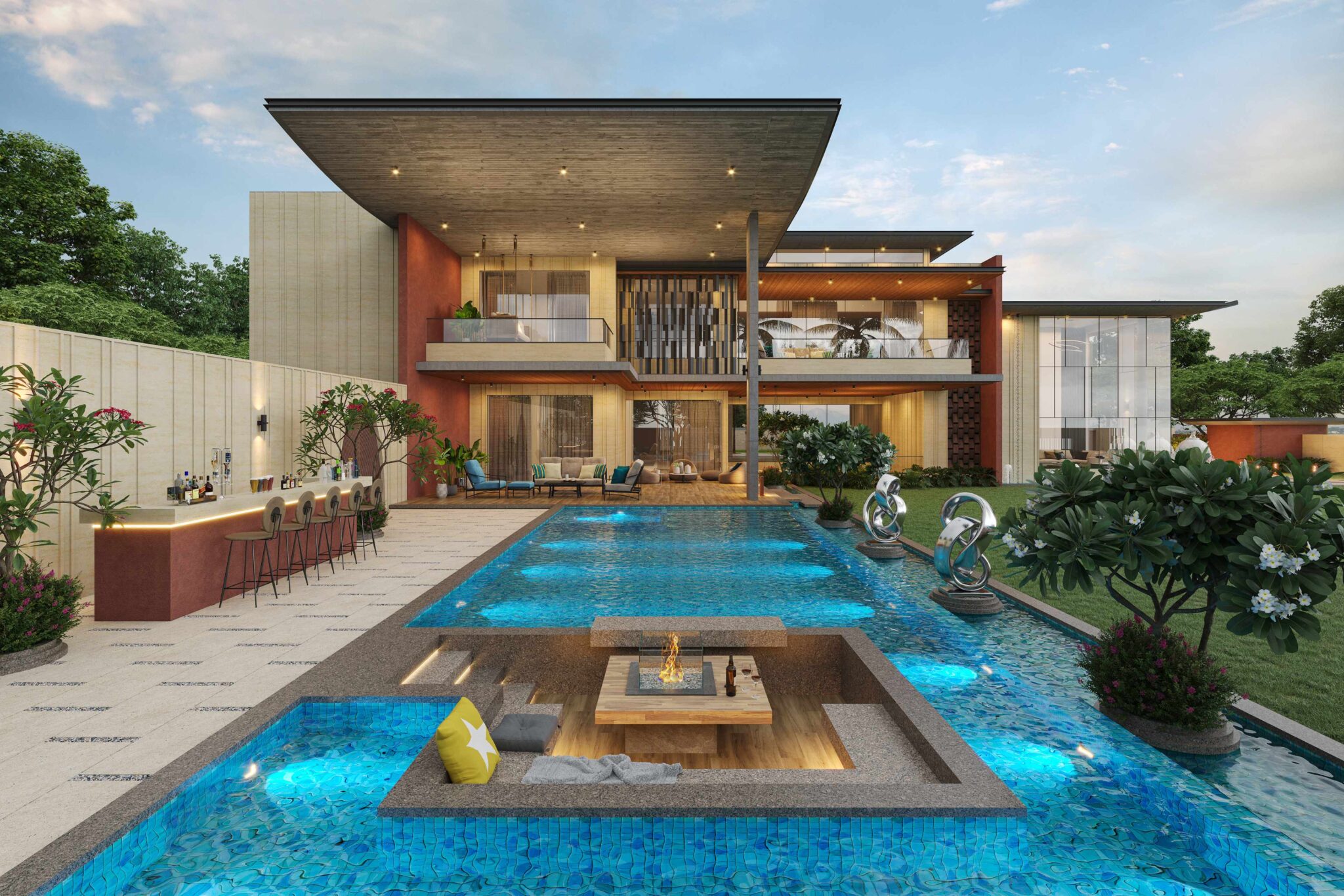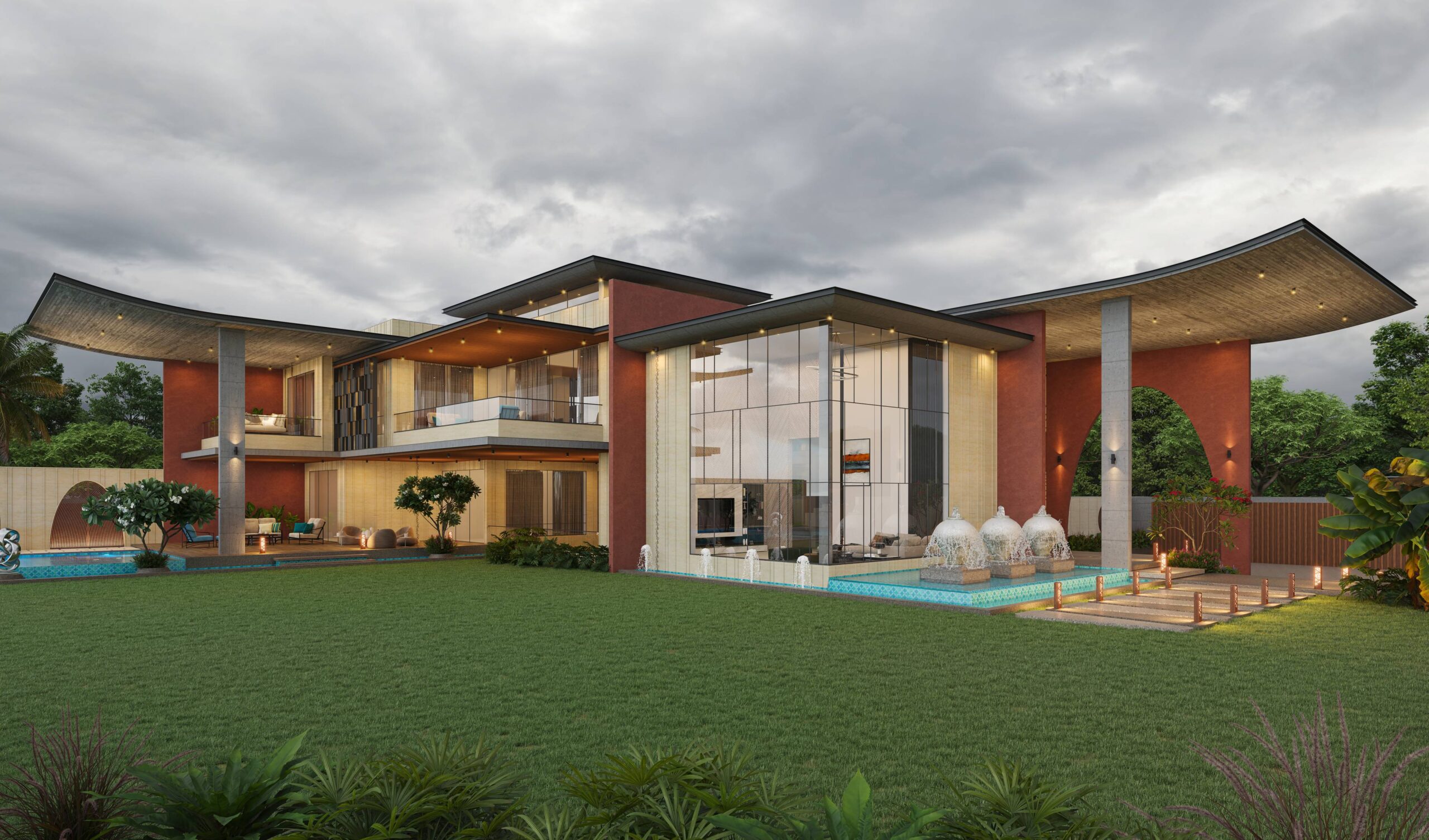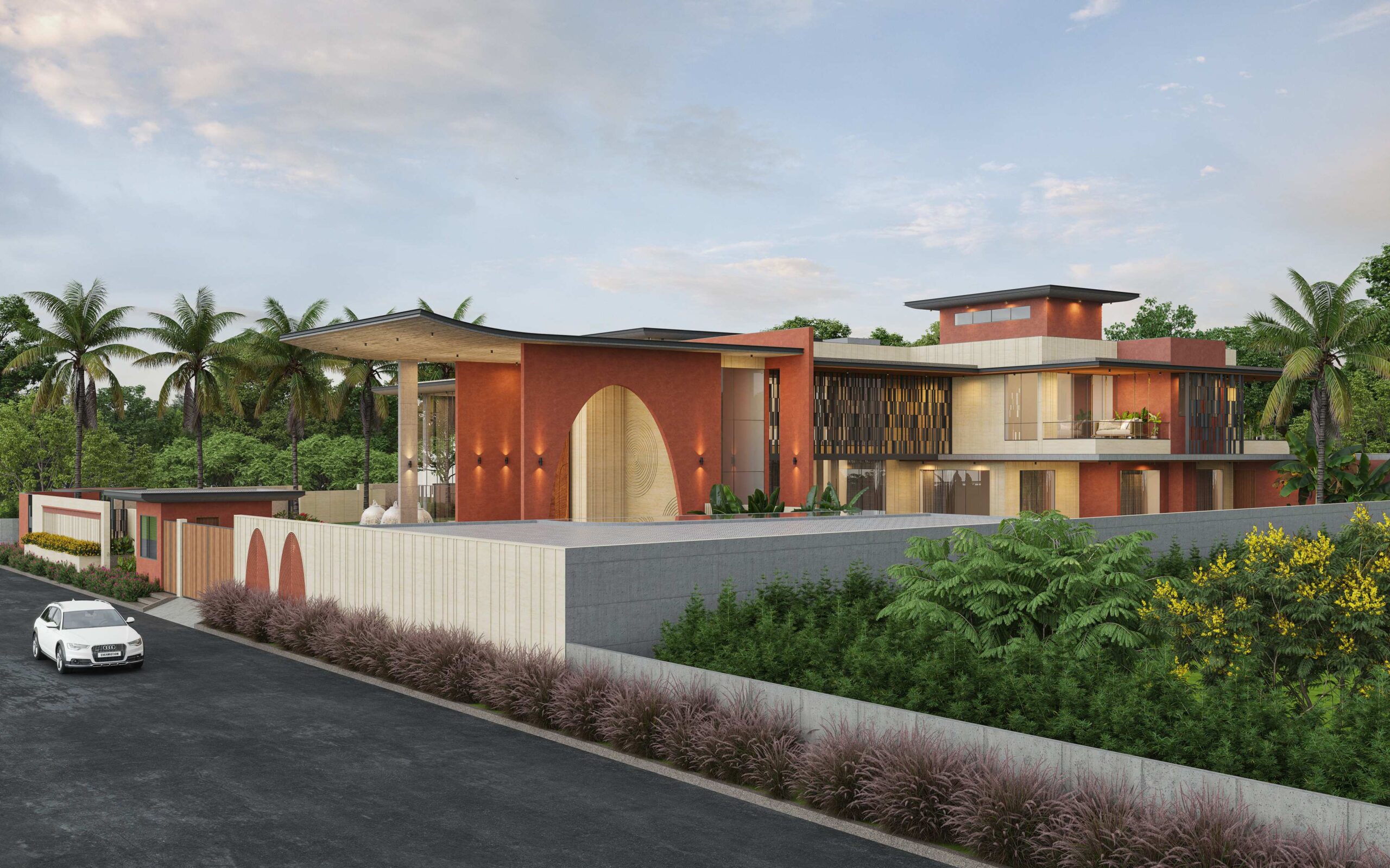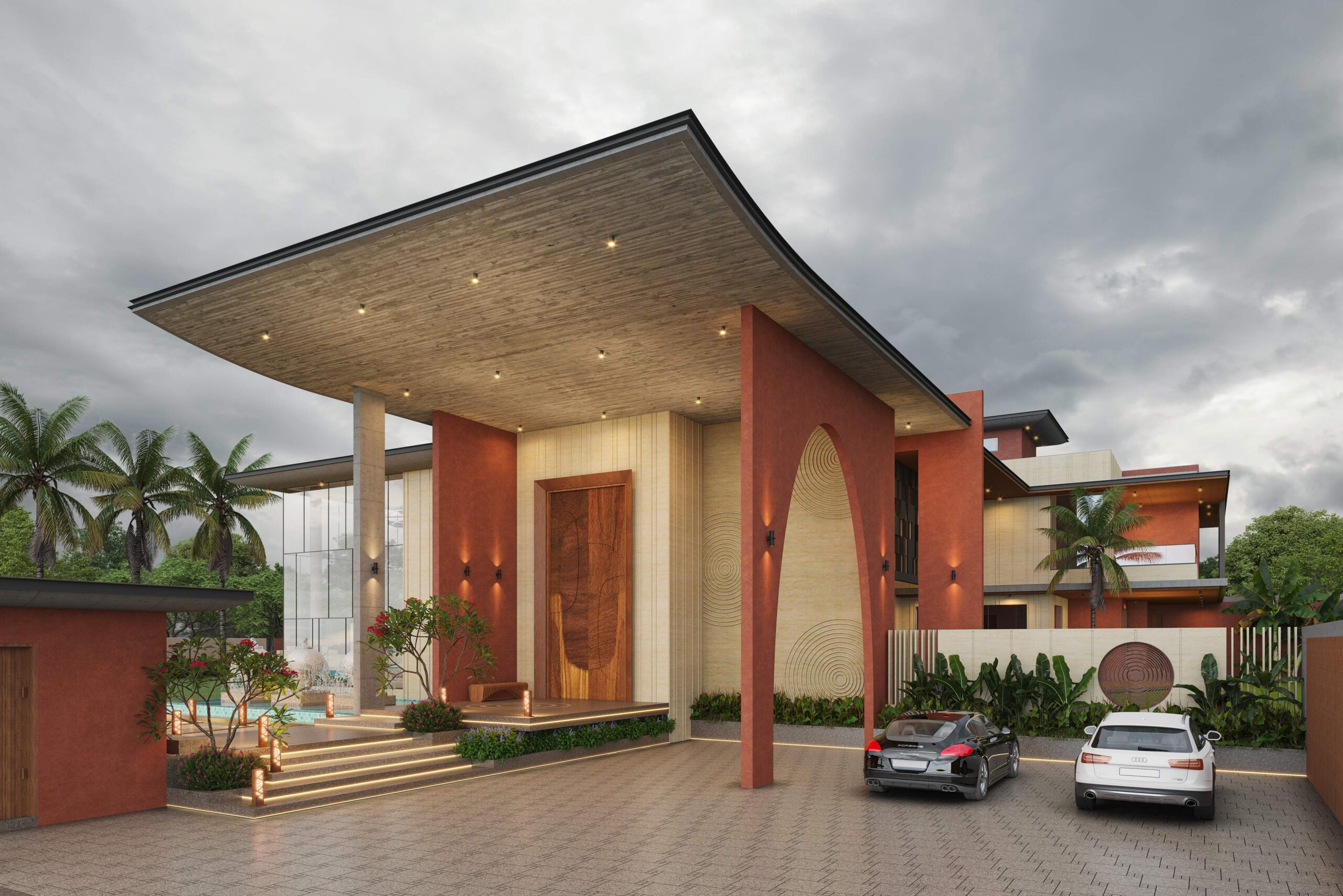 The house features artistically carved Mural wall at the entrance, a modern appearance with exposed brick, travertine stone cladding and cantilever balcony extending from the structure, adds a touch of architectural elegance with luxurious interiors. Entering the house, you ascend a stairway nestled beside a lush garden. The transition from outdoors to indoors is marked by a verandah canopy offering a feeling of shelter and warmth.