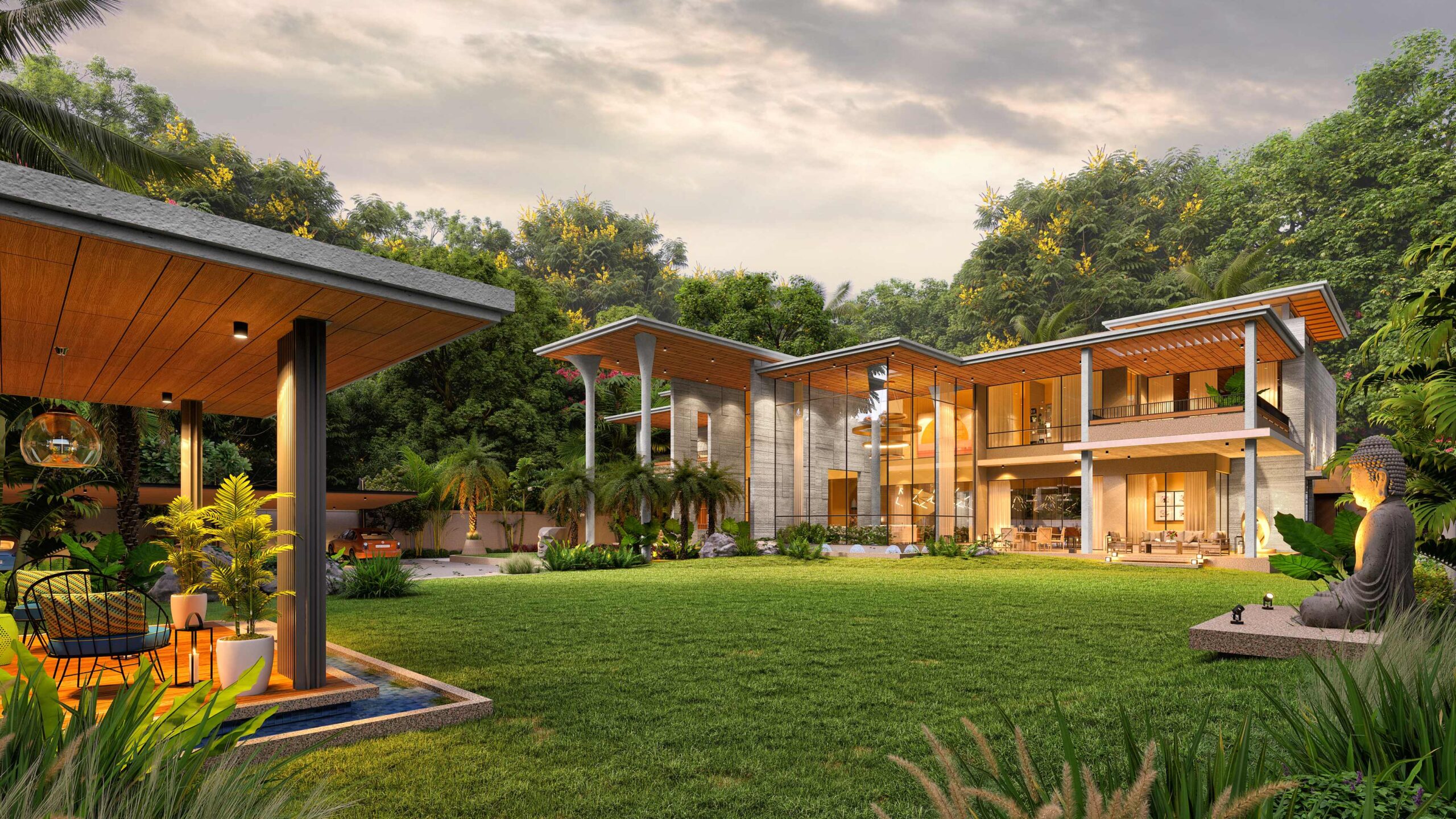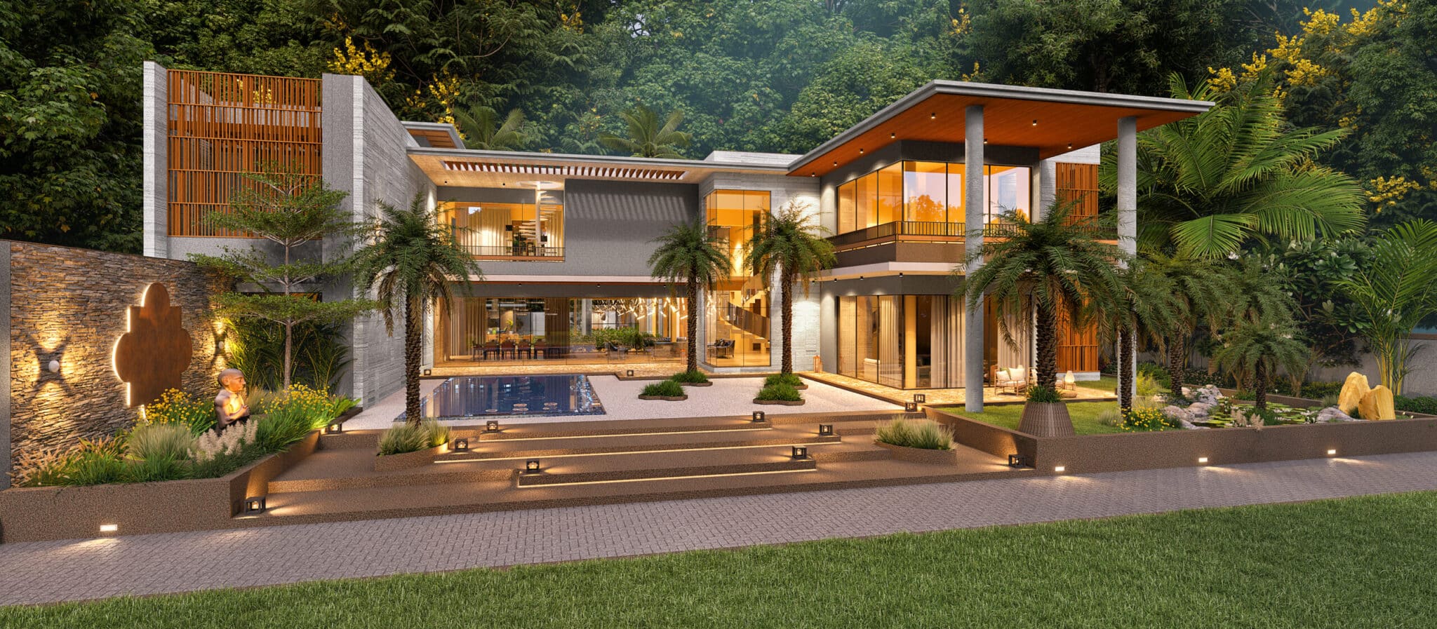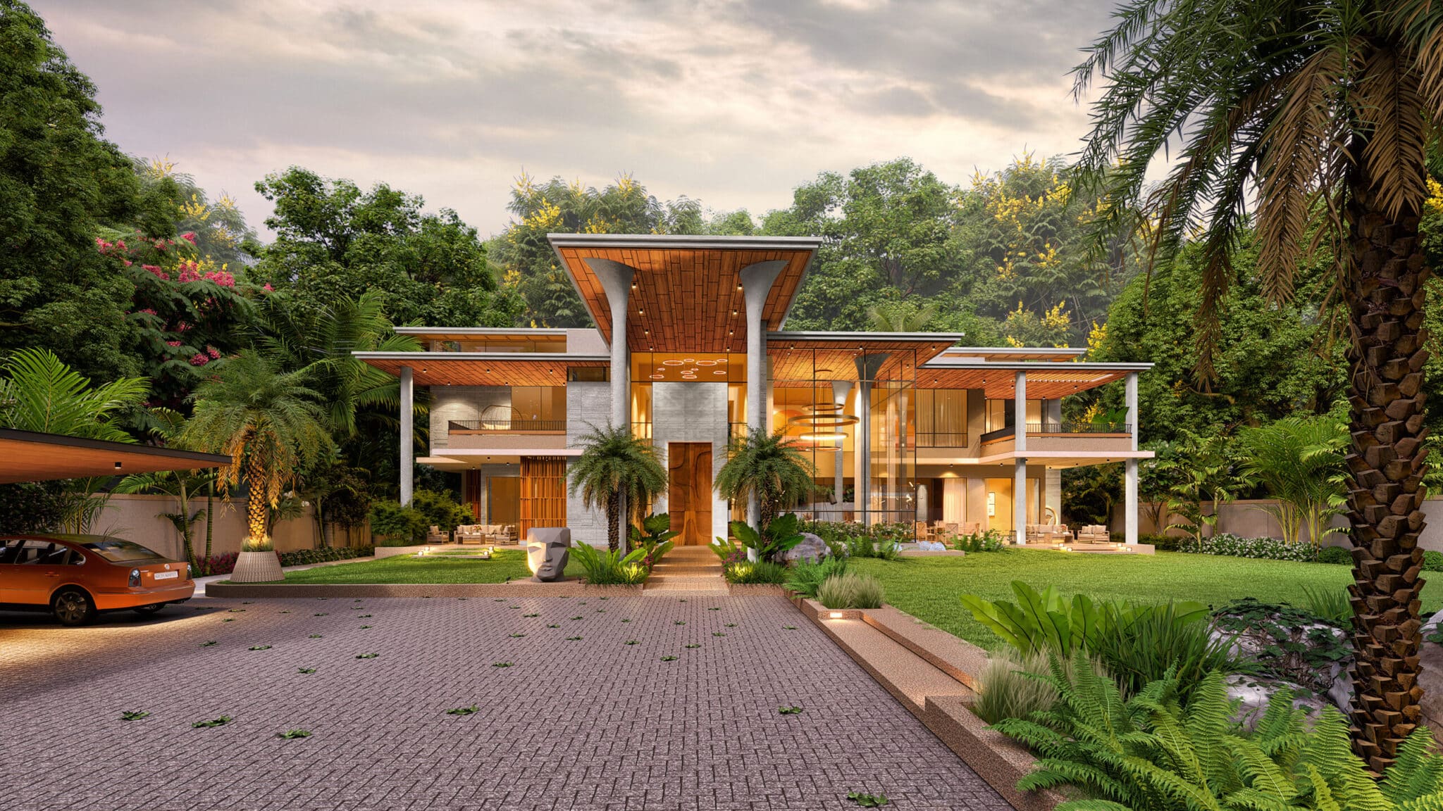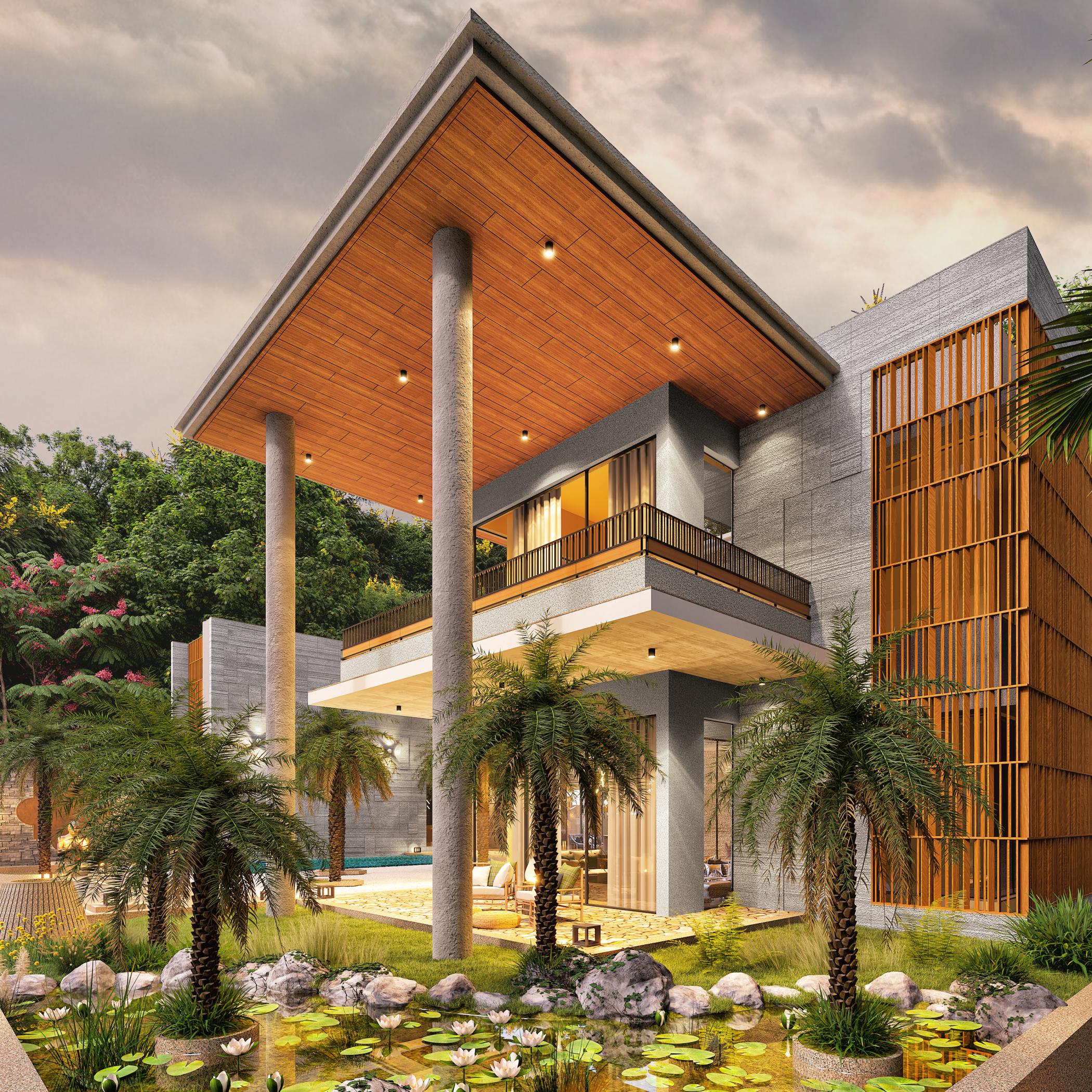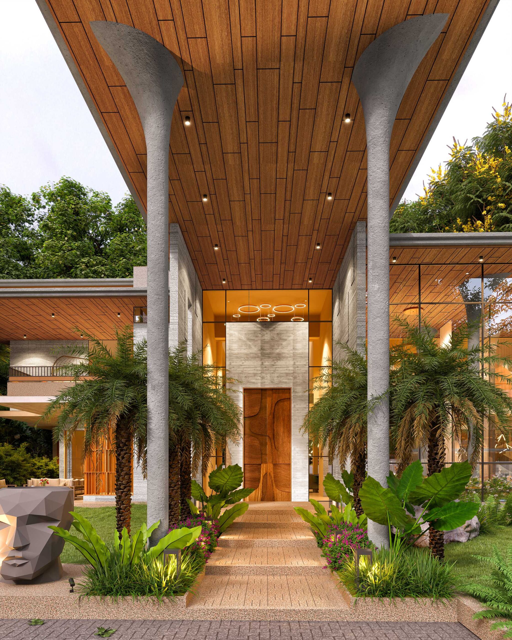 The house features artistically carved Mural wall at the entrance, a modern appearance with exposed brick, travertine stone cladding and cantilever balcony extending from the structure, adds a touch of architectural elegance with luxurious interiors. Entering the house, you ascend a stairway nestled beside a lush garden. The transition from outdoors to indoors is marked by a verandah canopy offering a feeling of shelter and warmth.
