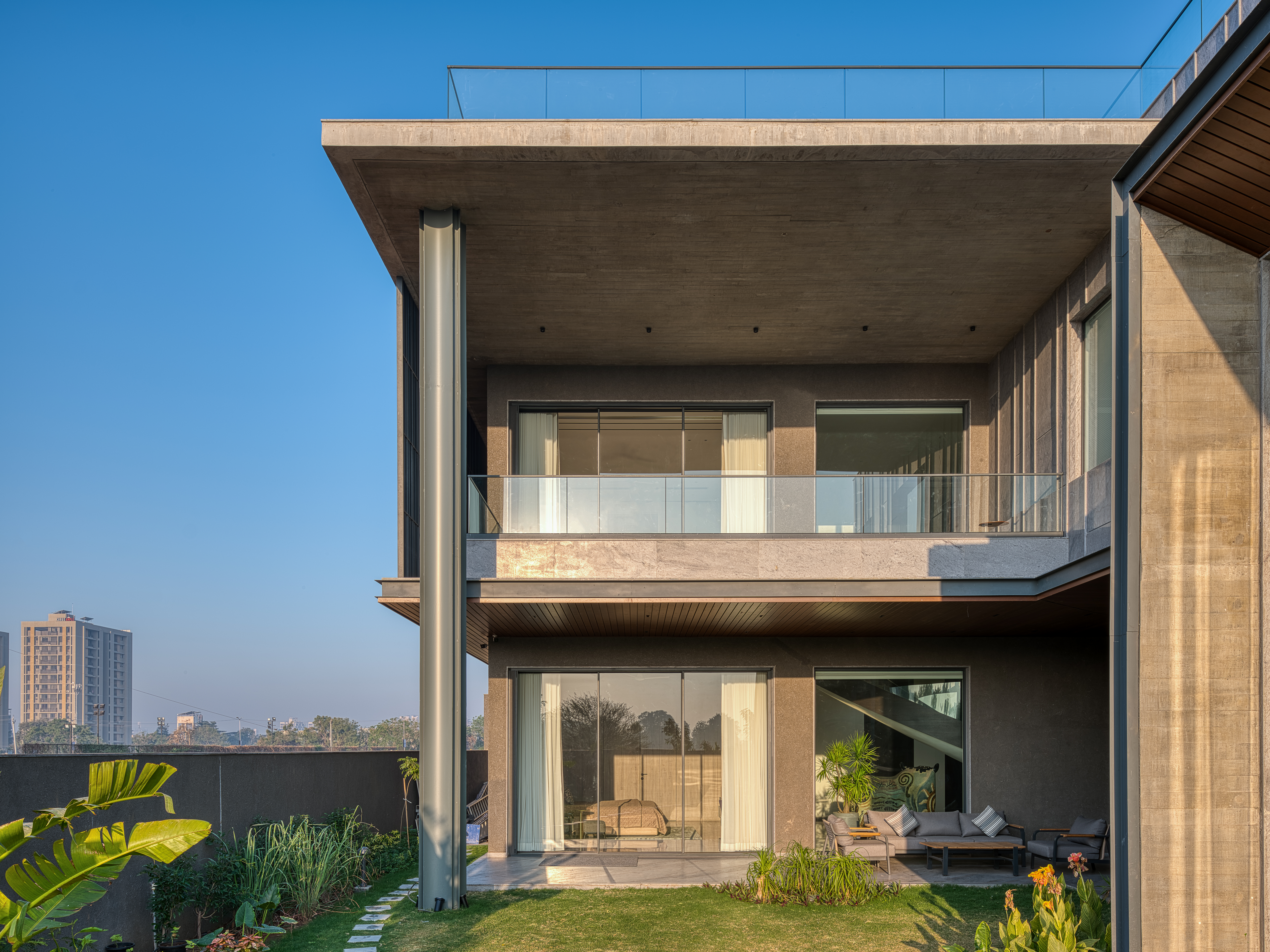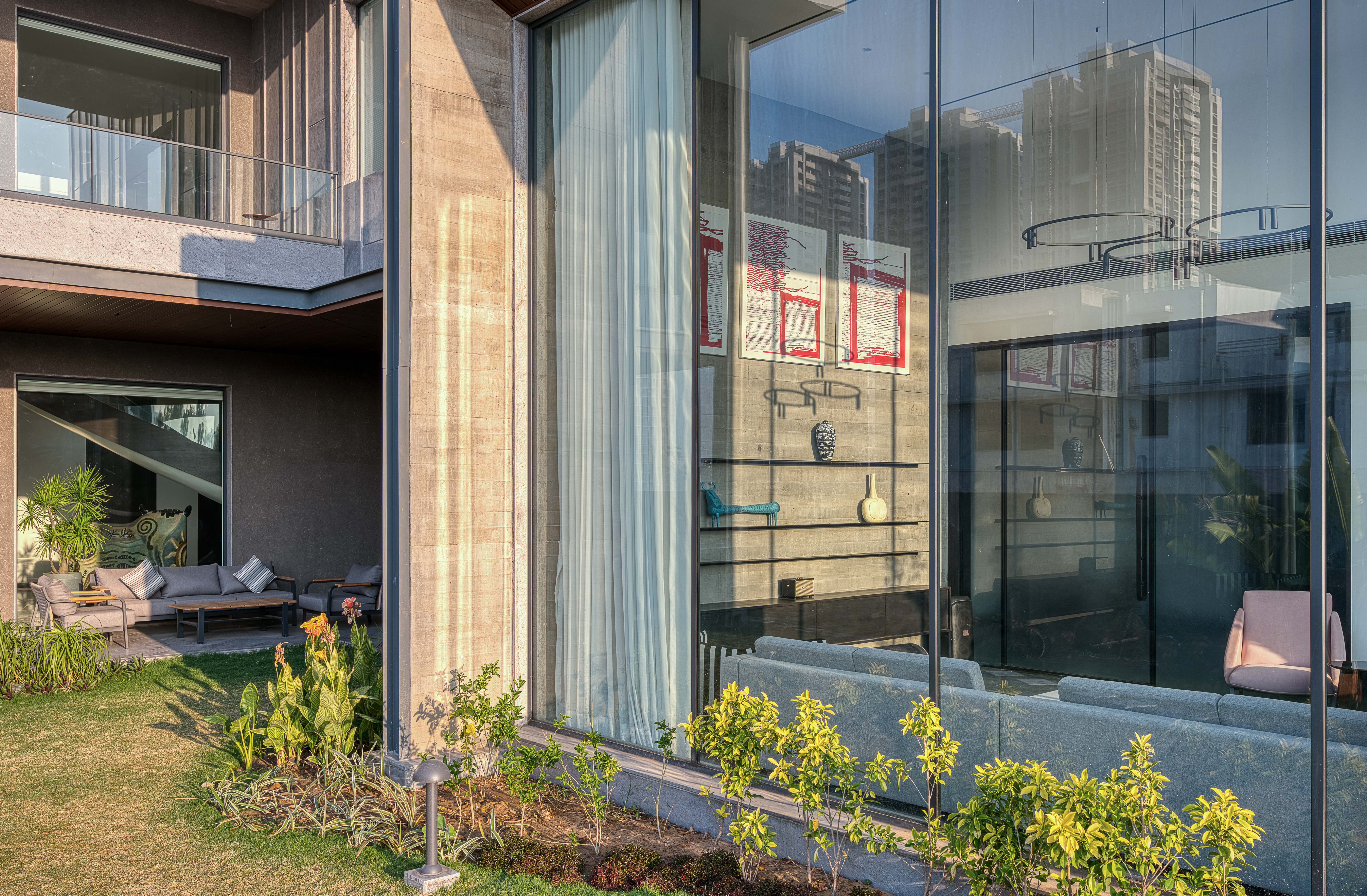 The Grid Houses, situated in Ahmedabad's Science City area, comprises of two identical residences on a single plot with different floor plans. Despite being separate, they blend harmoniously, creating a unified look from exterior and each maintains privacy although connected by garden in centre.